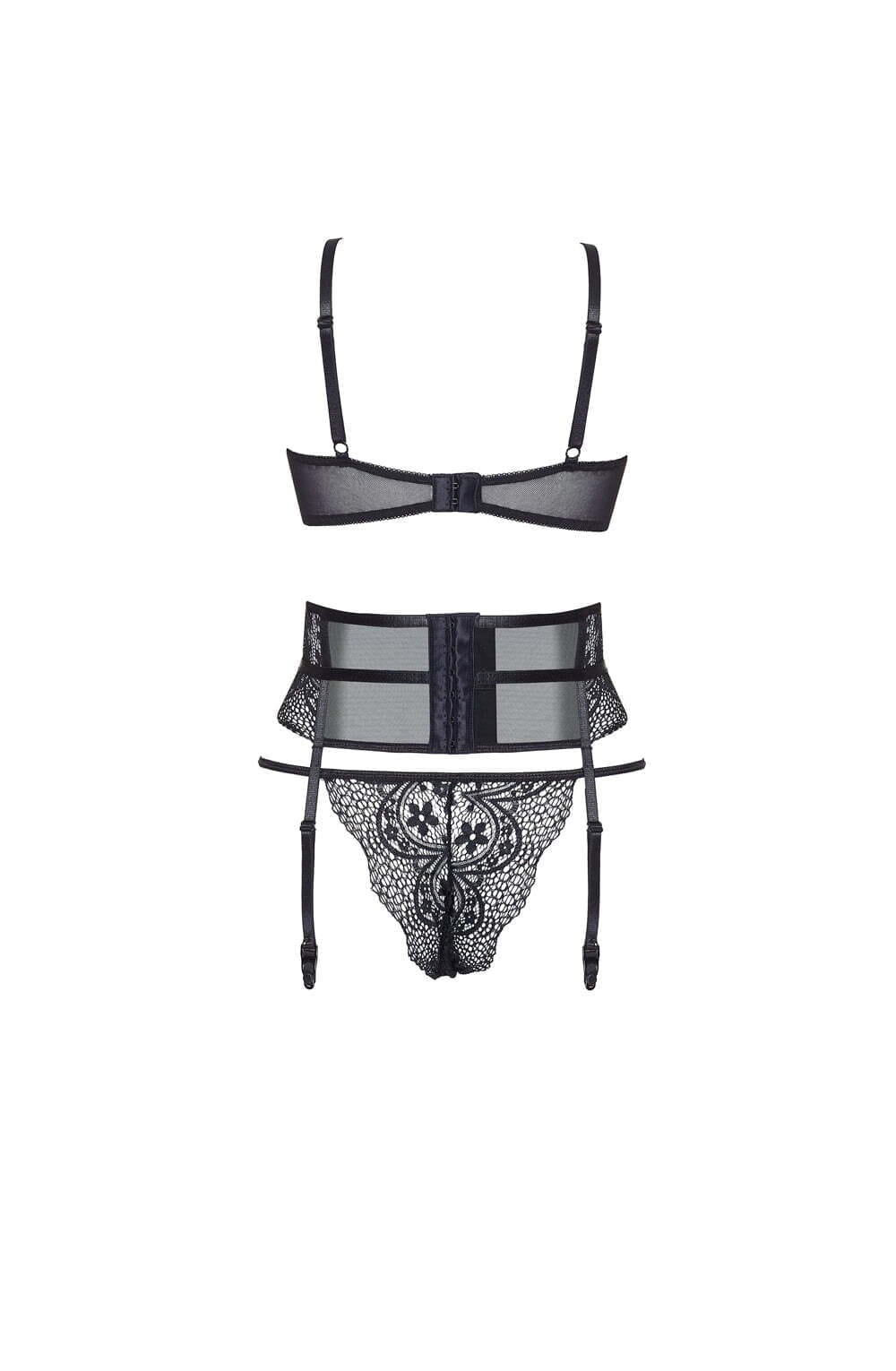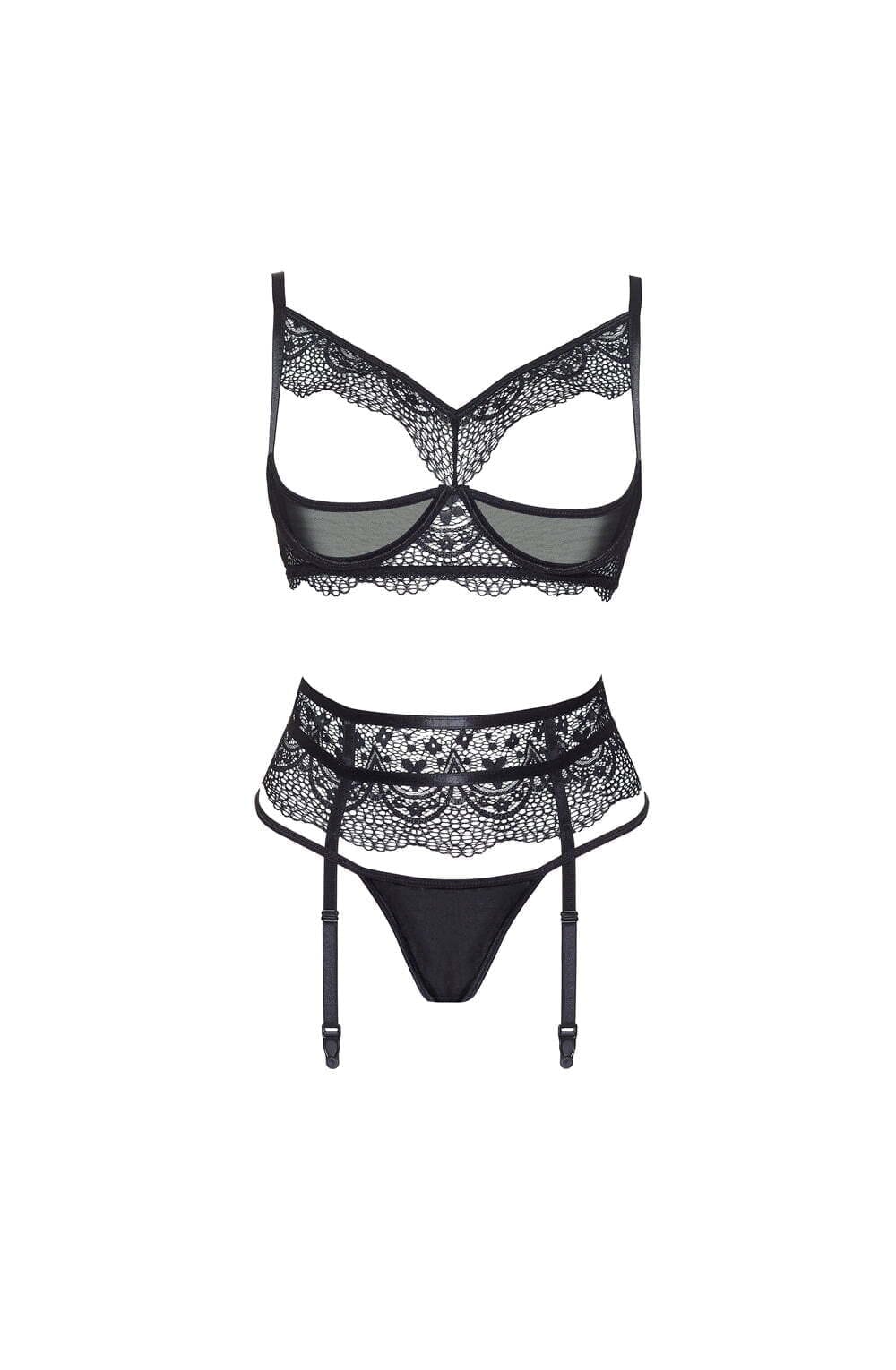 A very provocative three piece set that comprises an open cup underwired shelf bra, matching suspender belt and thong.  The black lace on Chiara is both stunning to look at with beautiful soft feel. (please note the nipple covers are not included – we have a range of nipple covers which are available separately). This item arrives packaged in a lovely Beauty Night box.