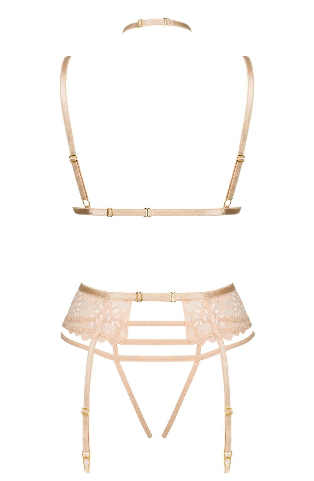 Discover the enchanting Noemi Lingerie Set, featuring a bra, open thong, and garter belt. Crafted from delicate lace, this set accentuates your natural beauty and exudes femininity and sensuality.