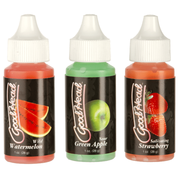 This set of oral sex enhancers intensify blow jobs by tingling, teasing, and sweetening the entire package. GoodHead Tingle Drops come packaged in easy to use 1 oz. drip bottles and three mouth watering flavors: Strawberry, Green Apple, and Watermelon. A couple drops are all you need. Three 1 fluid ounce bottles.