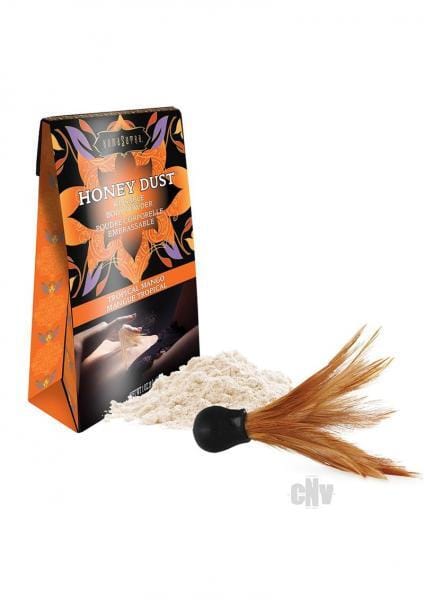 Kama Sutra Honey Dust Tropical Mango kissable, moisture wicking body powder that leaves skin silky soft and delicately scented. Talc free. Features: delicious, kissable body dust. Lightweight formula wicks away moisture, leaving skin soft and smooth. Six irresistible flavors, each imparts a delicate fragrance on the skin. Flavor: Tropical Mango. Sweet ripe mango. Use anywhere on the body. How to use: with your partner use the flirty feather applicator to dust Honey Dust onto the body and follow with kisses. As part of your daily regimen dust onto the body before dressing to stay cool and dry all day long. Be sure to remove any excess dust if wearing light colored clothing to avoid staining. For beautiful hair use as a dry shampoo by massaging a small amount into dry hair at the roots leaving it clean, with added volume and smelling amazing. Ingredients Tropical Mango: Corn Starch Modified, Glucose, Zea Mays Corn Starch, Honey, Silica, Sodium Saccharin, Fragrance, Sodium Benzoate, Amyl Cinnamal, Benzyl Alcohol, Benzoate Benzoate, Benzyl Salicylate, Citronellol, Eugenol, Geraniol, Hydroxy Citronellol, Linalool. 1 ounce travel size. Made in the USA