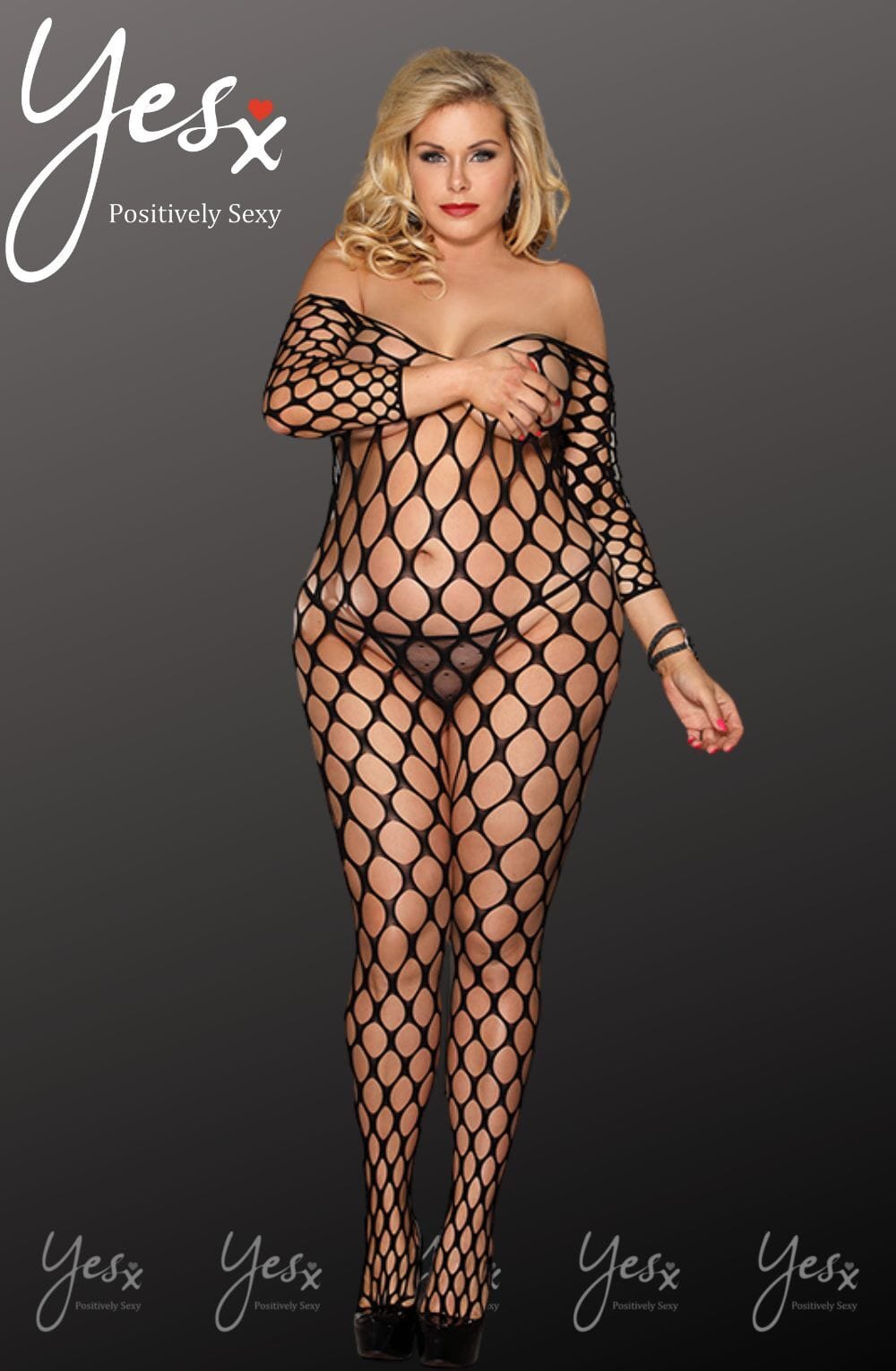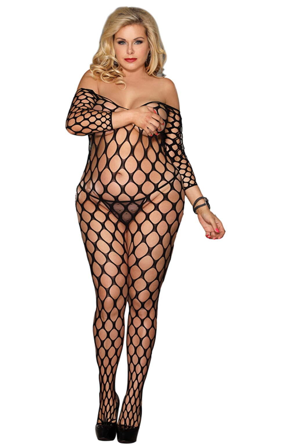 An all over holey design! This plus size bodystocking has three quarter sleeves and arrives packaged in a box. Please note thong is not included.