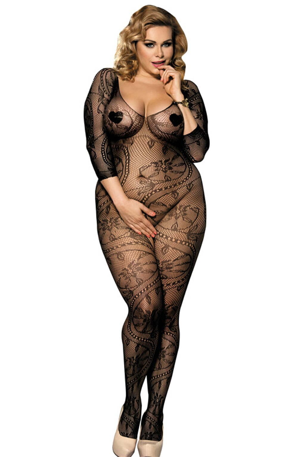 All over pattern design with three quarter sleeves (nipple covers not included but can be purchased seperately). Item arrives packaged in a box.