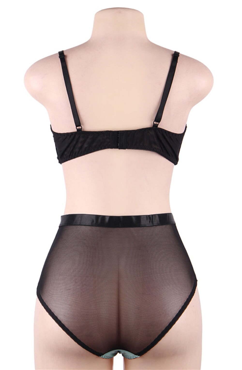 Beautiful two piece bra set. The bra is underwired, adjustable and decorated with black lace across the cups. The matching brief is also included.  Item arrives packaged in a Yesx Satin bag.
