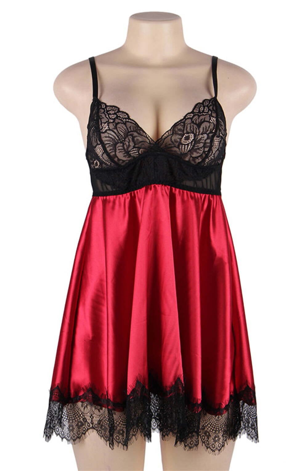 Beautiful flowing red satin babydoll with black lace cups.  The straps are adjustable and the hem is edged with deep eyelash lace. Matching lace blindfold is included. This item arrives packaged in a Yesx satin bag.