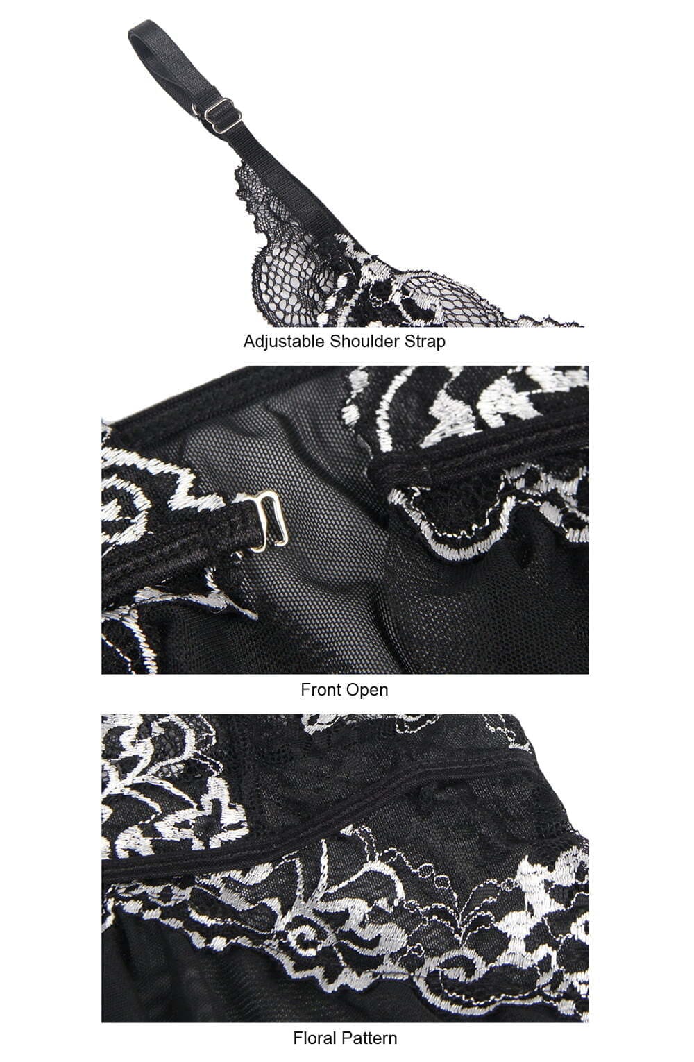 Beautiful floaty babydoll with adjustable shoulder straps and contrasting embroidery on the cups, front and back. Centre front fastening.  The item comes with a matching thong and arrives packaged.