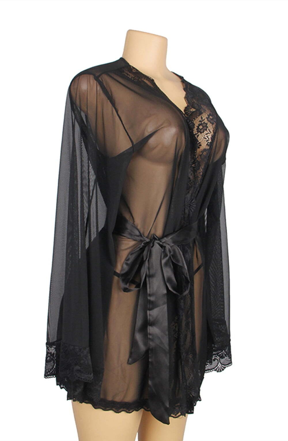 A stunning floaty gown which is edged in black lace and ties at the front with a satin belt. The matching thong is included.  Item arrives packaged in a Yesx satin bag.