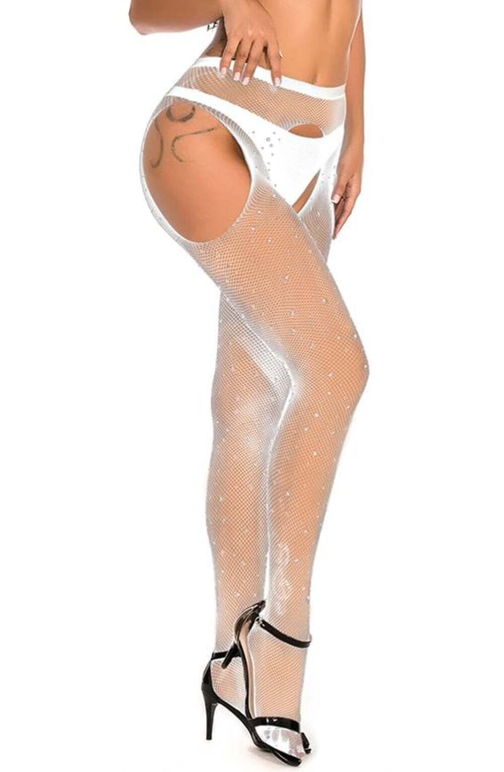 Elevate your elegance with these White Fishnet Crotchless Tights, featuring a delicate shimmering effect. The classic fishnet design exudes allure, while the subtle sparkle adds a touch of sophistication. Perfect for those who appreciate both boldness and refined style, these tights invite confidence and playfulness into your intimate moments (thong not included)