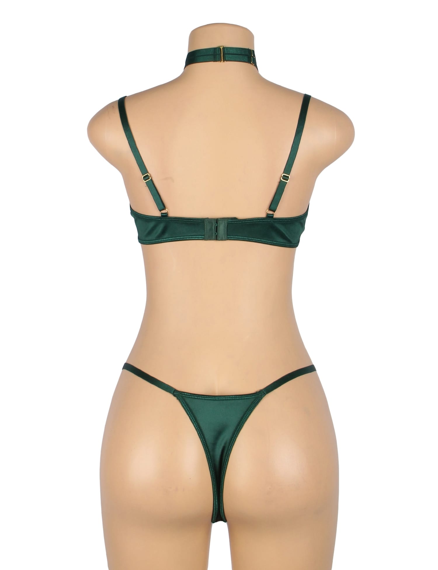 Indulge in bold elegance with this luxurious green bra and thong set, featuring a soft, velvety feel that adds a touch of sophistication. The structured bra is designed with daring cut-outs, adding a hint of intrigue, while delicate gold hardware details bring a glamorous finish. Complete with a halter-style choker neckline and adjustable straps, this set offers a customised fit that perfectly highlights your curves. The matching high-cut thong is finished with gold accents for a polished look. Ideal for those moments when you want to feel both seductive and effortlessly stylish!