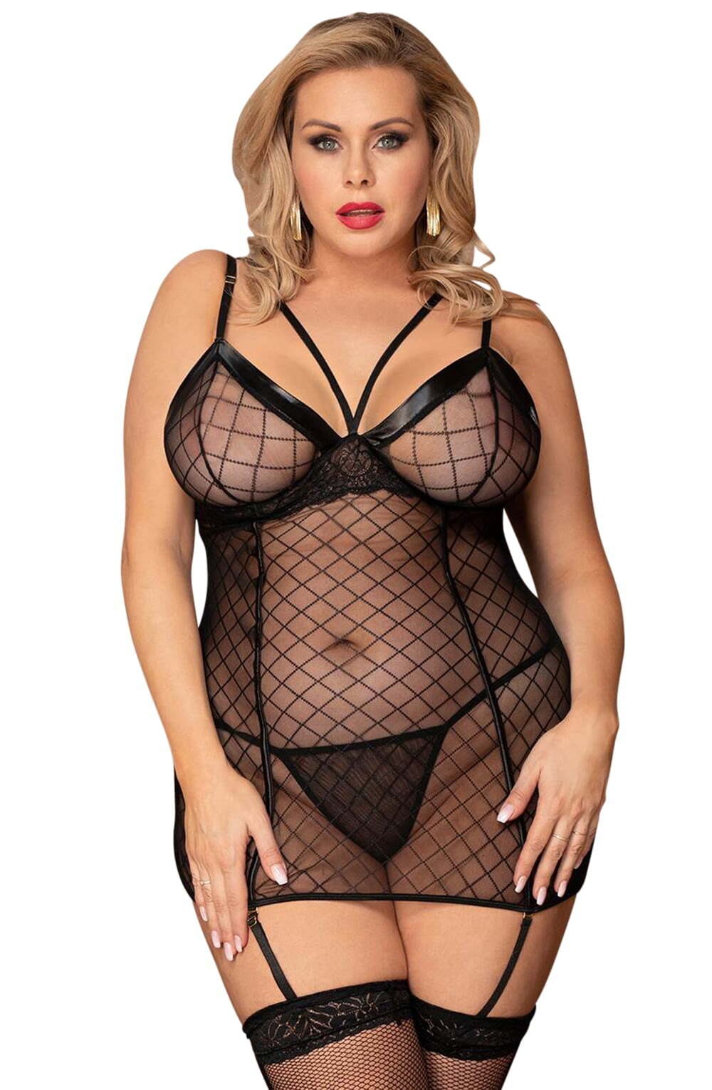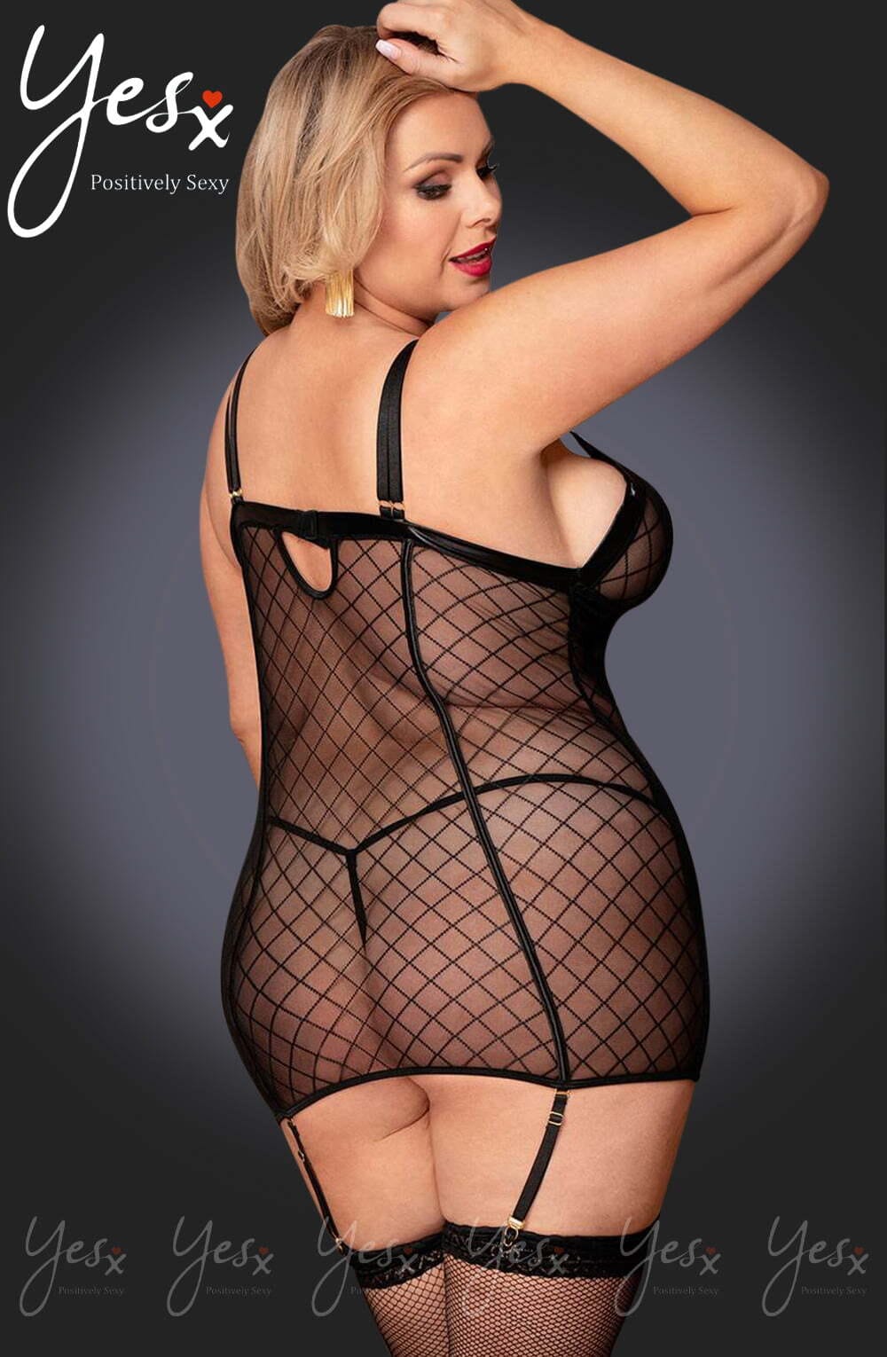 A seductive mesh chemise with feminine lace and wet look trim along the plunging neck line. The chemise has adjustable shoulder straps and arrives with matching black mesh thong and removable suspender straps. PLEASE NOTE: Stockings not included. Please see related products.This item arrives packaged in a YesX satin bag.