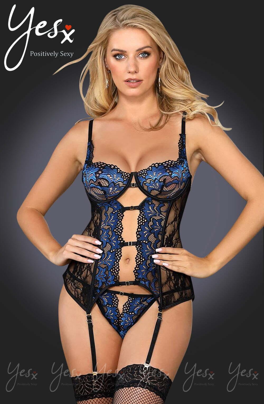 A beautiful lingerie set with stunning delicate lace. This set features underwired cups with adjustable shoulder straps and hook and eye back fastening. Matching thong is included and the suspender straps are removable. PLEASE NOTE: Stockings not included. Please see related products.This item arrives packaged in a YesX satin bag.