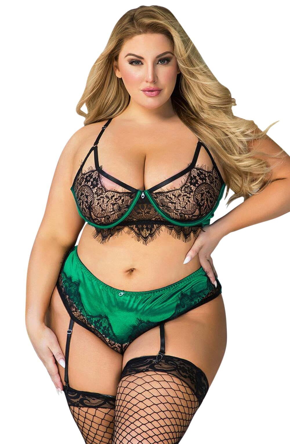 A seductively elegant set that combines a beautiful mix of lace and emerald fabric. The set features a bra with adjustable shoulder straps and underwired cups. The bottoms of this set have attached suspender straps. PLEASE NOTE: Stockings not included. Please see related products.This item arrives packaged in a YesX satin bag.