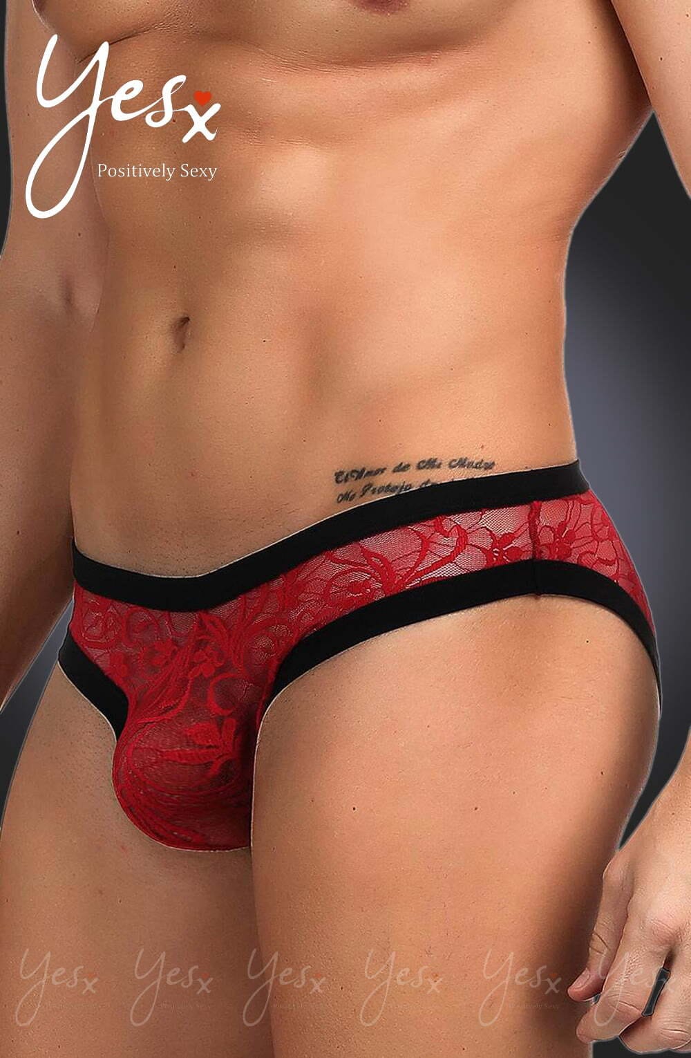 Red sheer floral lace with black trim men’s brief that are guaranteed to make a sexy addition to your lingerie collection.